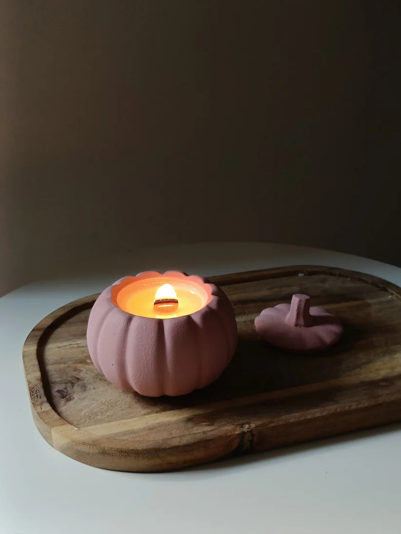 Χειροποίητο τσιμεντένιο δοχείο σε σχήμα κολοκύθας, γεμισμένο με κερί σόγιας, διαθέσιμο σε 3 παστέλ αποχρώσεις, μπεζ, πορτοκαλί και σάπιο μήλο. Μια ιδανική επιλογή για φθινοπωρινή διακόσμηση του χώρου σου.
